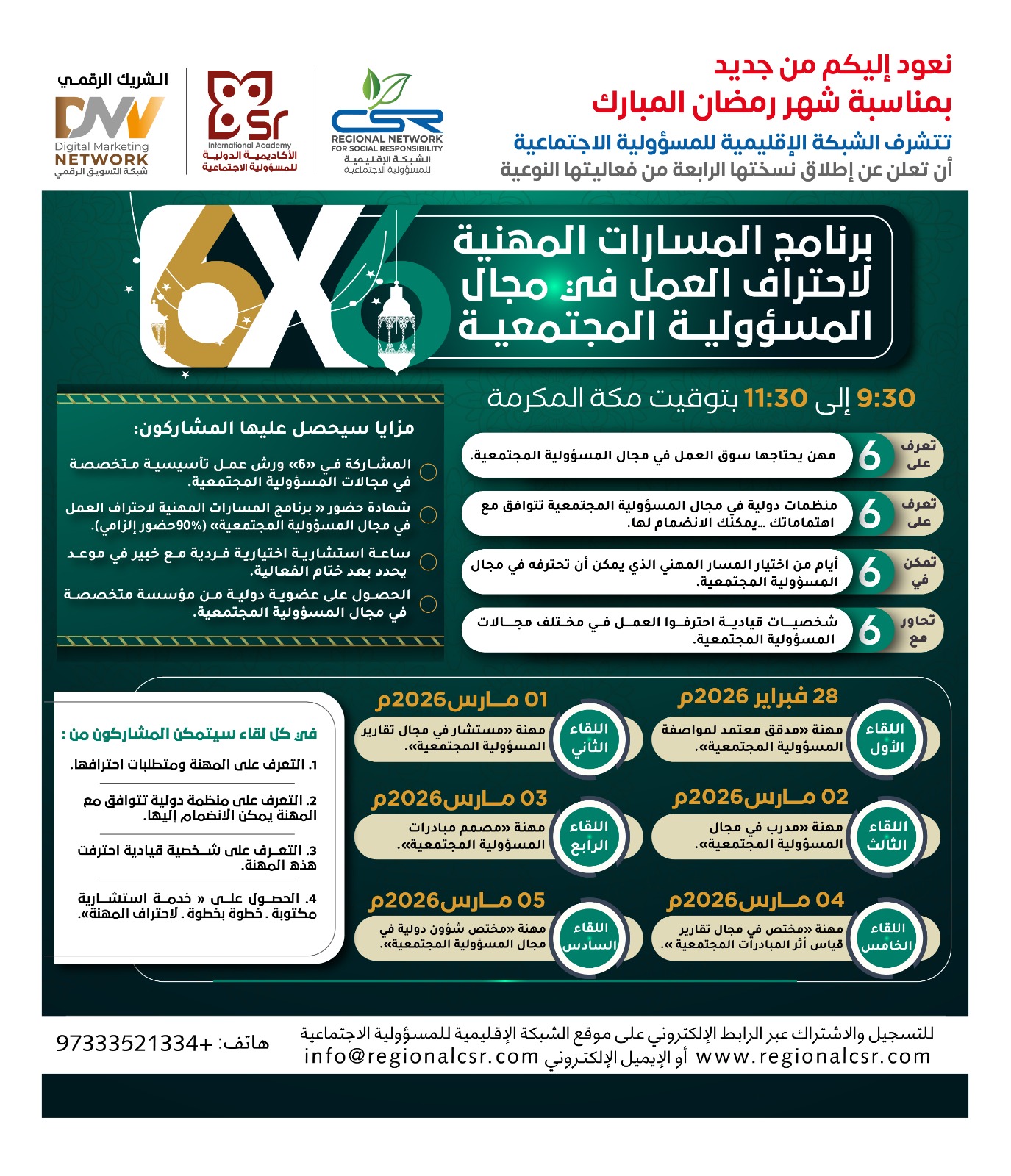 - المشاركة في 6 ورش عمل تأسيسية متخصصة في مجالات المسؤولية المجتمعية.