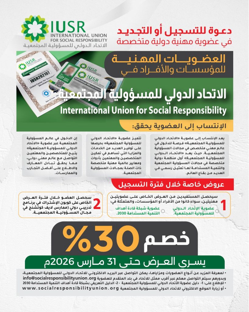يعد الإنتساب إلى عضوية” الاتحاد الدولي للمسؤولية المجتمعية ” فرصة للدخول في عالم مهني متخصص في مجالات المسؤولية المجتمعية. حيث يعد “الاتحاد الدولي للمسؤولية المجتمعية “أول منظمة دولية متخصصة في مجالات المسؤولية المجتمعية والتنمية المستدامة لها تمثيل رسمي في العديد من بقاع العالم.